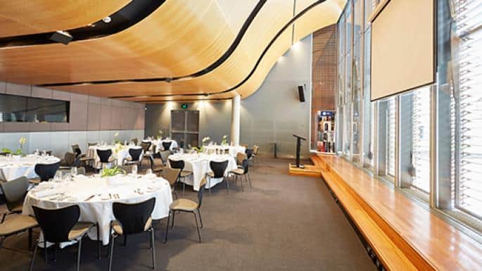Glass, timber and a flowing, curved ceiling – the innovative design of this room provides great flexibility and choice for your next conference, product launch, special event or AGM. Automated cedar louvre screens make this a stunning venue for that special reveal. Motorised glass panes allow a flow of fresh air, and access to an expansive sandstone courtyard for refreshments. The stylish bar also opens to the courtyard and is perfect for cocktail parties and pre-dinner drinks.